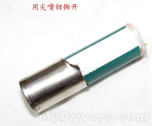 然后,用尖嘴鉗從電芯蓋帽位置暴力撕開,將正極與負極鋼殼分離,露出安全閥和卷包的正負極材料。